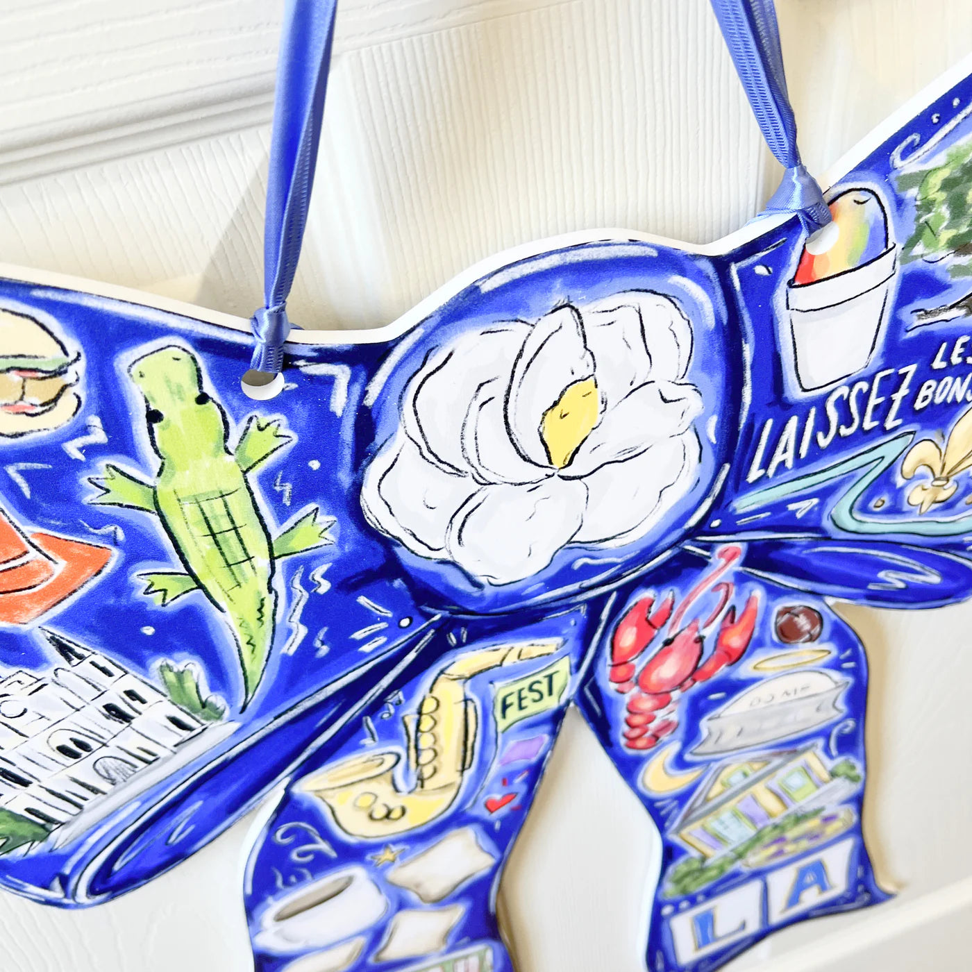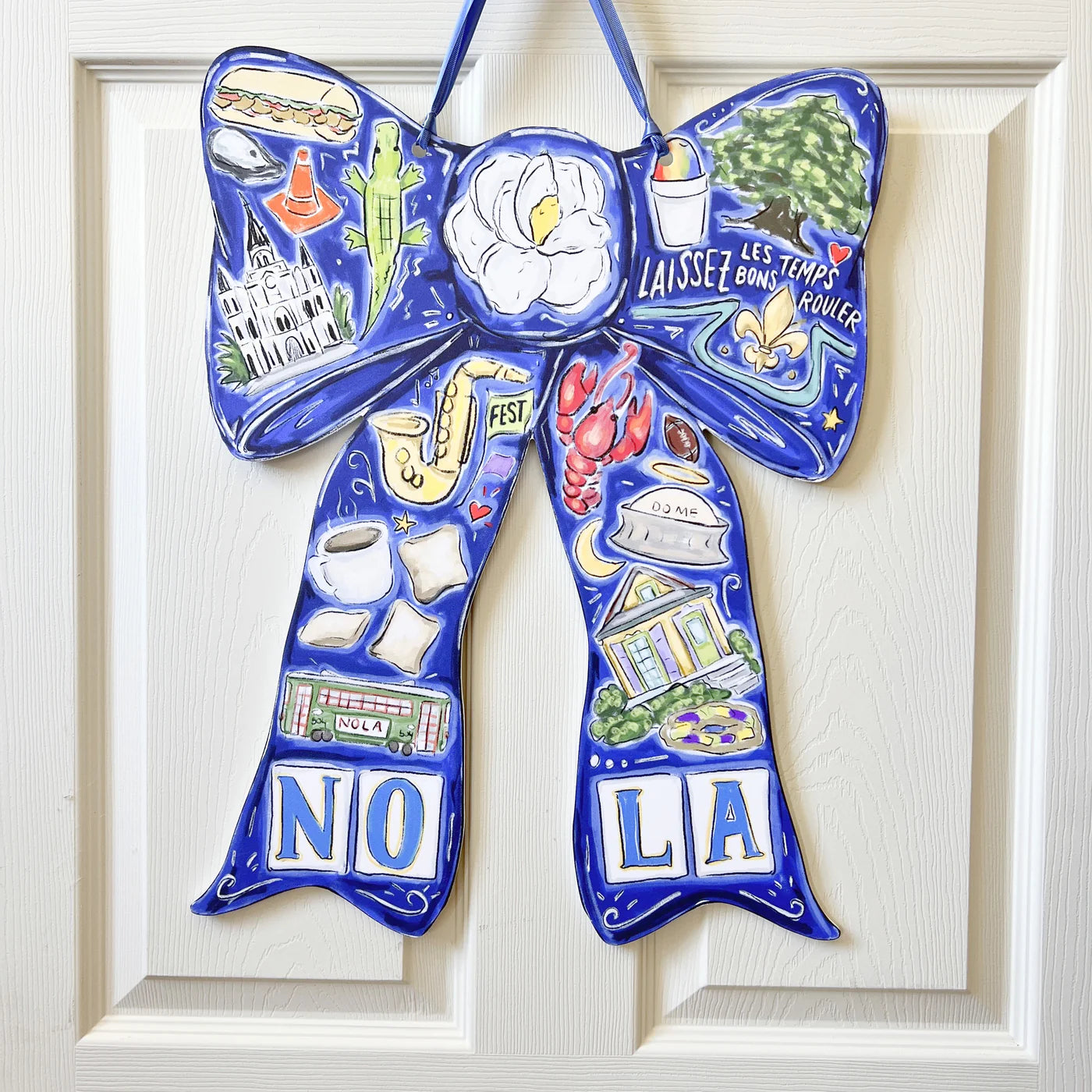 Alligators, crawfish, cathedrals, beignets and more make up this cute blue Best Of NOLA bow. This stylish design is in for the coquette trend!