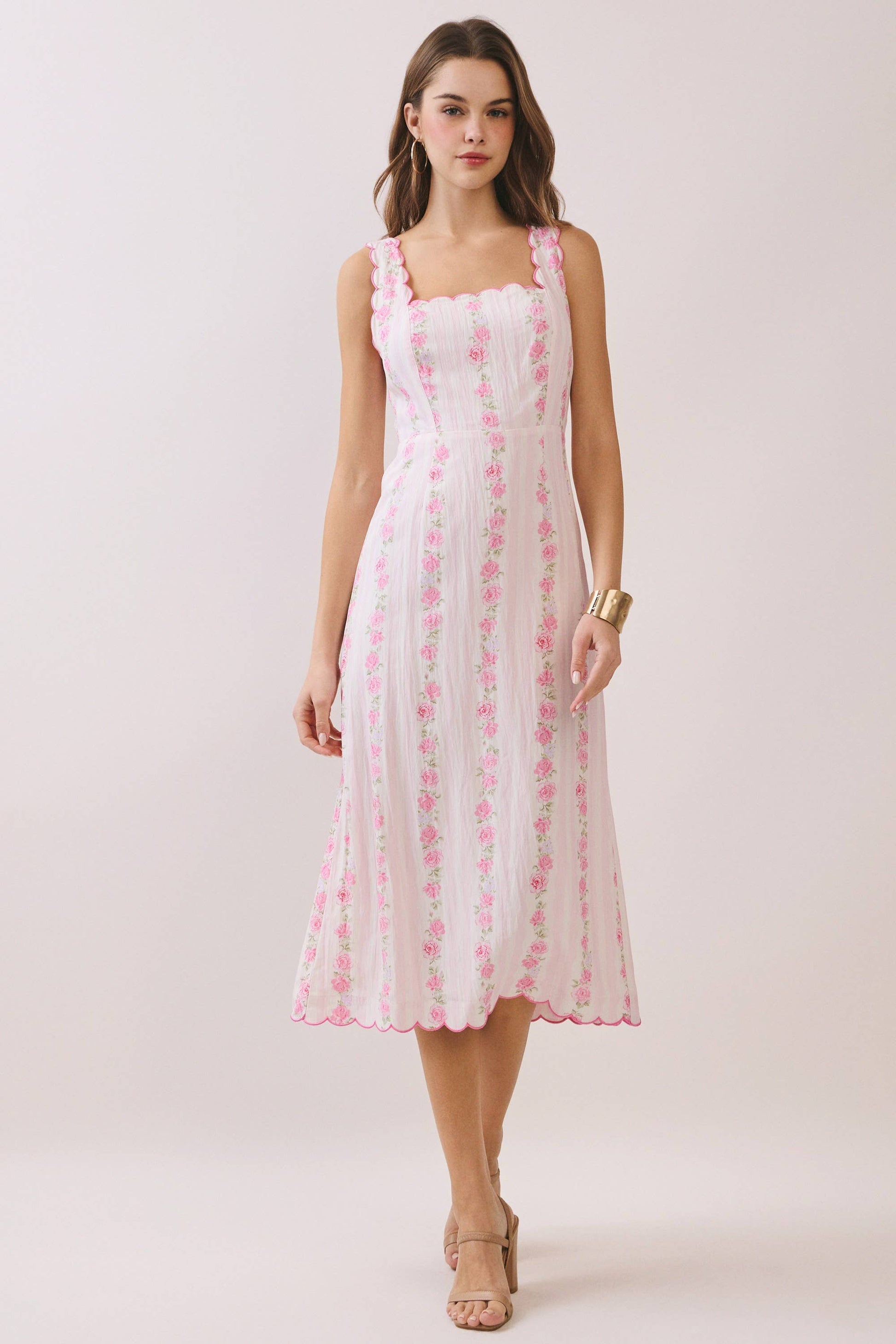 This floral midi dress features a soft square neckline, wide scalloped straps, and a smocked back for a comfortable, flattering fit. Finished with a scalloped hem and back slit for beautiful movement.