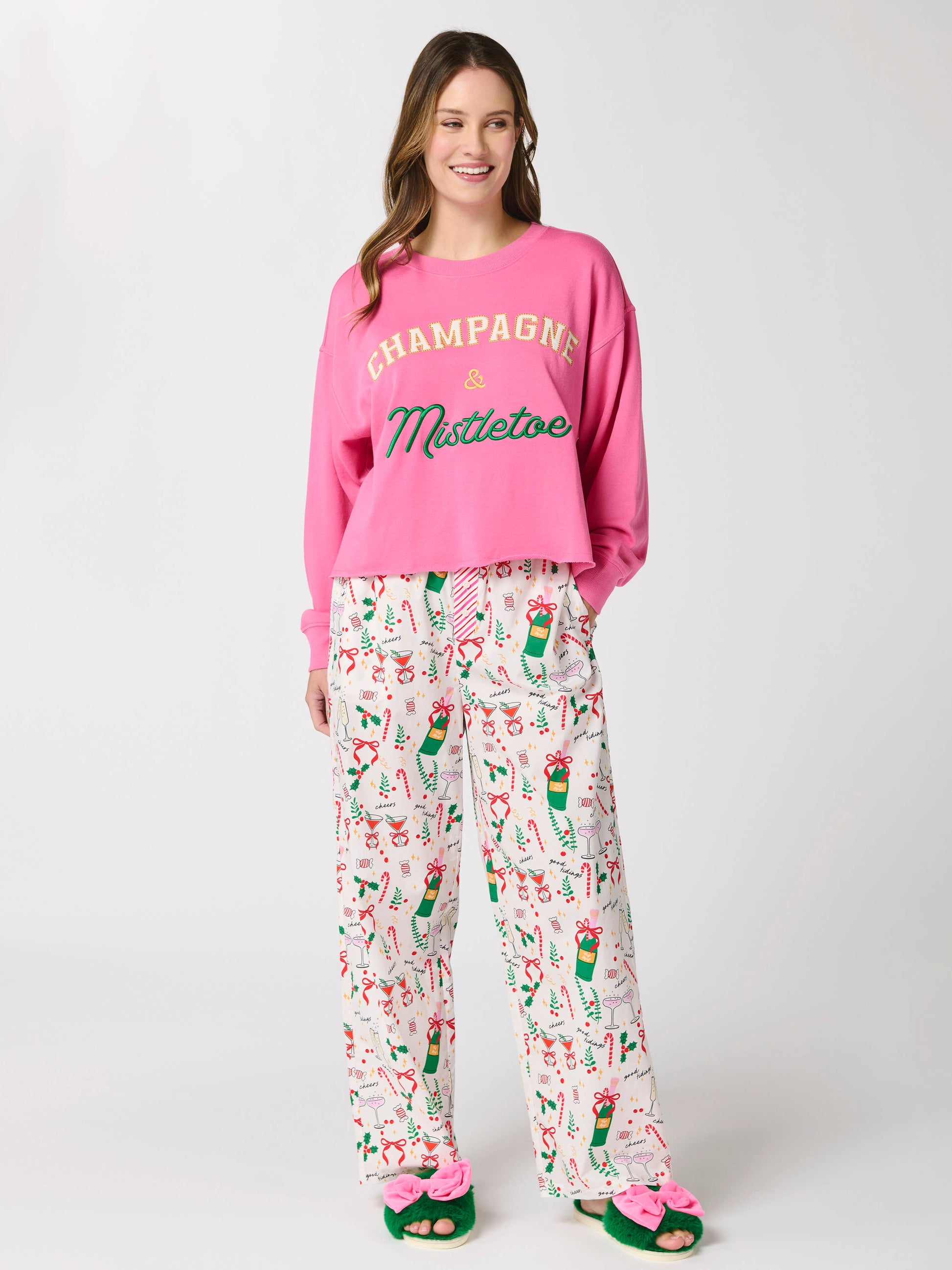 Pop the bubbly and bring on the cozy with our “Champagne & Mistletoe” Lounge Sweatshirt. This festive favorite features a bright pink base and playful text in gold and green embroidery that instantly puts you in the holiday spirit. With its relaxed fit and soft fabric, it’s perfect for sipping, snacking, and snuggling all season long.