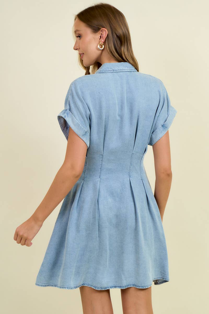 Classic denim with a flattering twist — The Cinched Chambray Shirt Dress is designed to highlight your shape while keeping things easy and effortless. Made from soft, lightweight Tencel chambray, this mini dress features a timeless collared neckline and full button-down front. Thoughtful vertical pleats and structured seams gently cinch the waist, creating a feminine silhouette without sacrificing comfort. Finished with cuffed short sleeves and a relaxed skirt, this dress is perfect for everyday wear, brunch dates, or casual nights out.