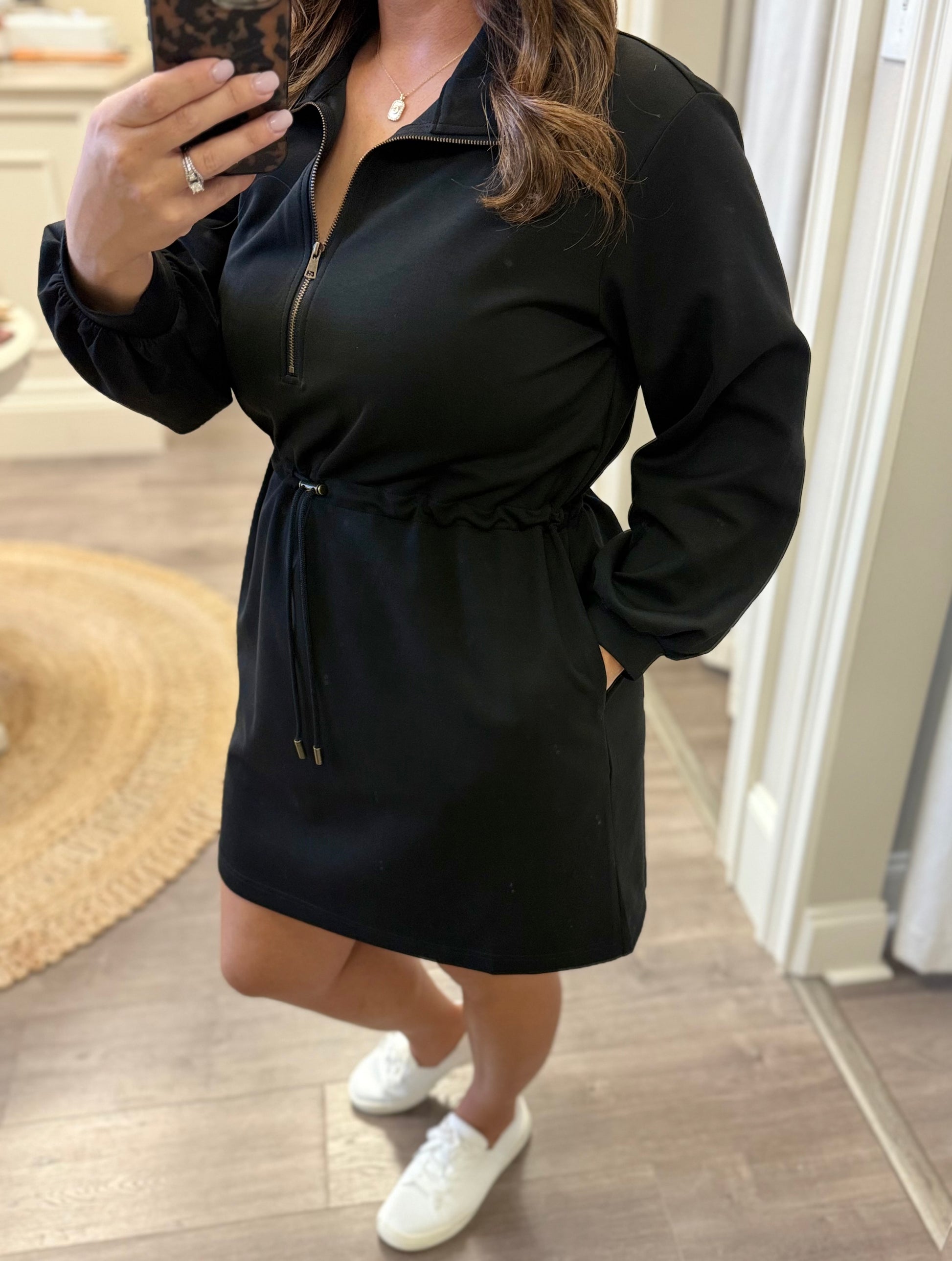 The Everyday Ease Half-Zip Dress is the perfect blend of comfy and cute! Made from a soft, medium-weight knit, it features a flattering drawstring waist, functional half-zip neckline, and side pockets for that laid-back yet put-together look we all love. Effortless to style — throw it on with sneakers for errands or pair with booties and gold jewelry for an elevated casual vibe.