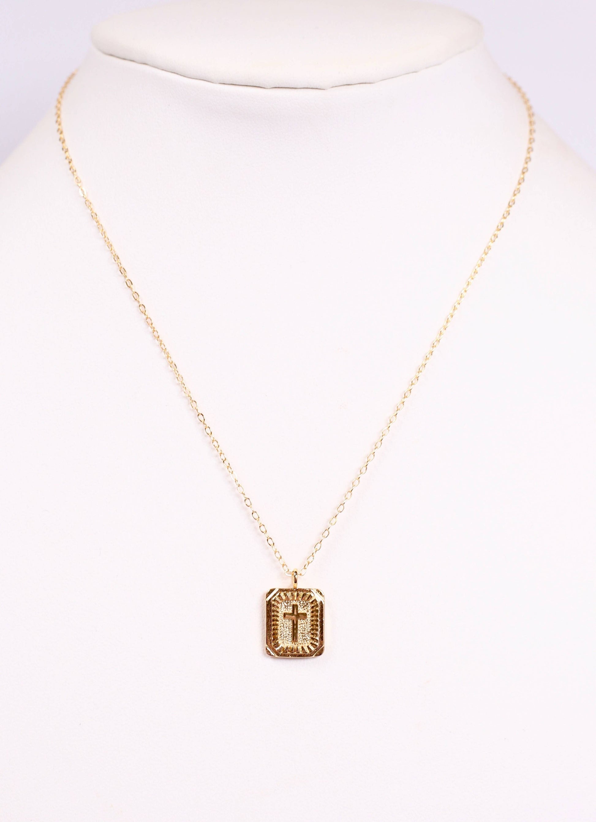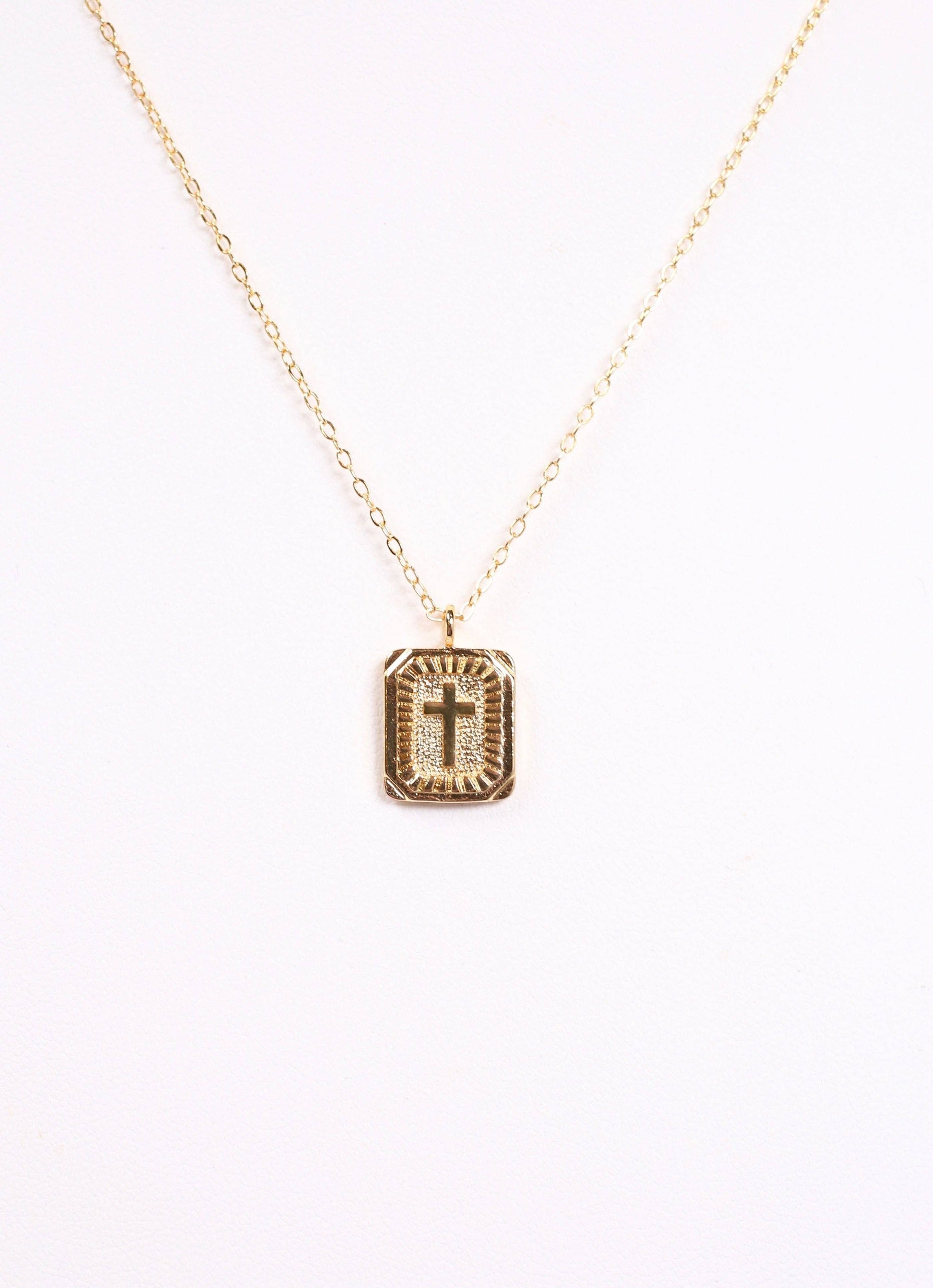 This dainty necklace has a metal plate charm with a ribbed design and a center cross accent. It has the same design on both sides of the charm. Gold dipped.