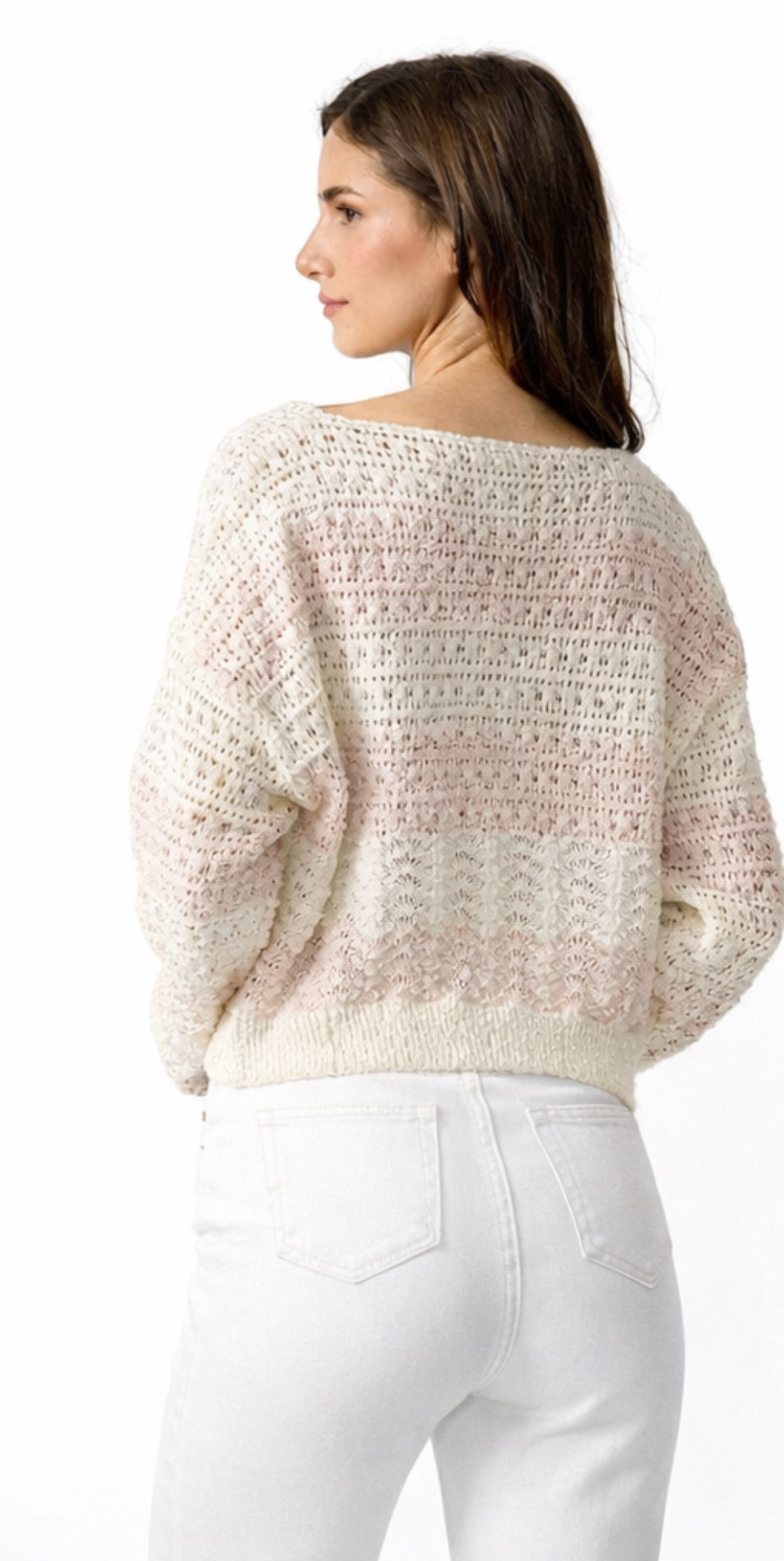 Soft, airy, and effortlessly pretty — the Blush Breeze Open-Knit Sweater is a must-have layering piece for the season. Designed with a lightweight open-knit texture and subtle pastel stripes in blush pink and creamy ivory, this sweater offers the perfect balance of comfort and style. Featuring a relaxed fit, long sleeves, and a slightly cropped hem, it’s ideal for pairing with white denim, skirts, or shorts for an easy, feminine look. Breathable and cozy, this sweater transitions beautifully from casual days to cool evenings.