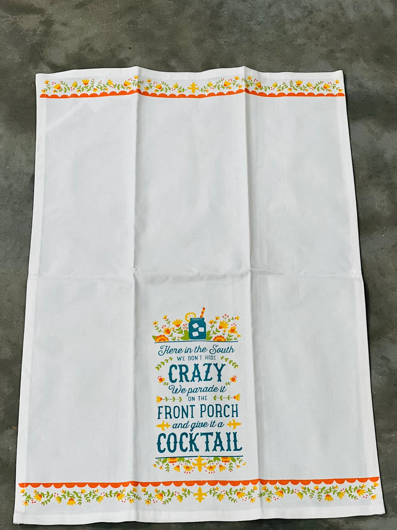 Add a splash of Southern sass to your kitchen with this vibrant tea towel featuring the playful saying: “Here in the South We Don’t Hide Crazy—We Parade It on the Front Porch and Give It a Cocktail.” Printed in cheerful blues, oranges, yellows, and greens, the design also showcases a mason jar of sweet iced tea surrounded by blooming flowers. It’s a colorful celebration of Southern charm, humor, and hospitality.