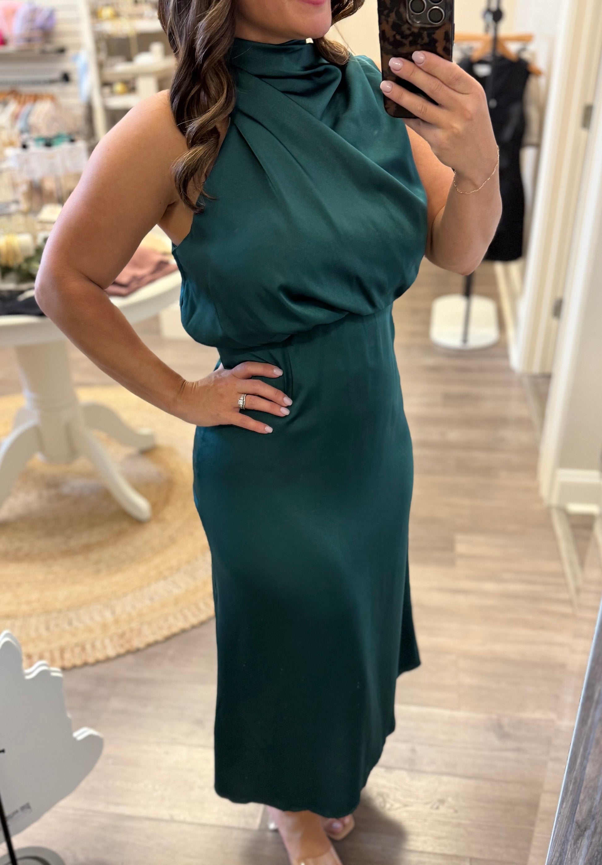 Elegant and timeless, this sleeveless satin midi dress features a draped high neckline, cinched waist, and flowing A-line skirt. Perfect for weddings, formal events, or a chic evening out—available in emerald, navy, and fuchsia.