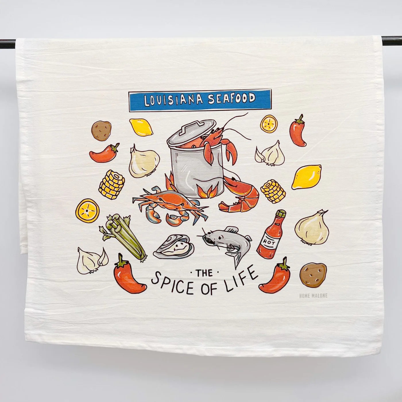 We take pride in our Louisiana seafood, including year round seafood boils and fish fry party. It's our spice of life all on a cute New Orleans inspired kitchen dish towel.