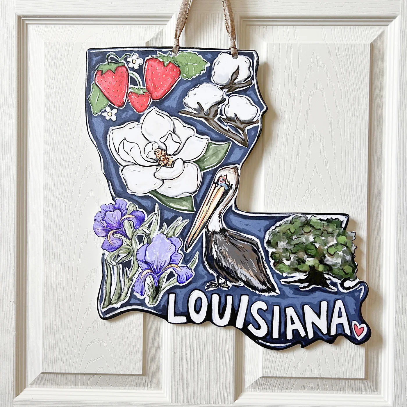 Celebrate your pride for the state of Louisiana with this charming door hanger design that features all of The Pelican State's iconic favorites: strawberries, cotton, a pelican, magnolias, purple bearded irises, and an oak tree!