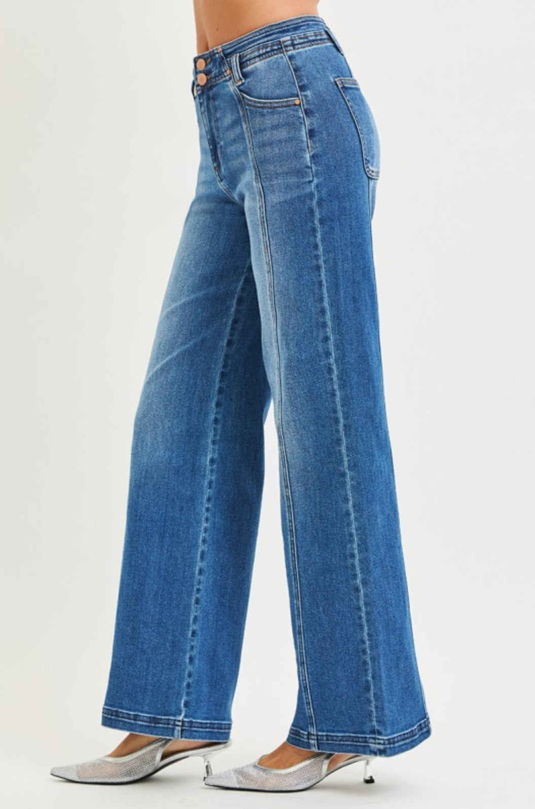 Meet your new denim obsession. These Risen high rise wide leg jeans feature a sleek curved seam detail that sculpts the waist and elongates the leg for a super flattering silhouette. Designed with just the right amount of stretch for all-day comfort while keeping that structured look we love. Dress them up with heels or keep it casual with sneakers—either way, they’re a total vibe.