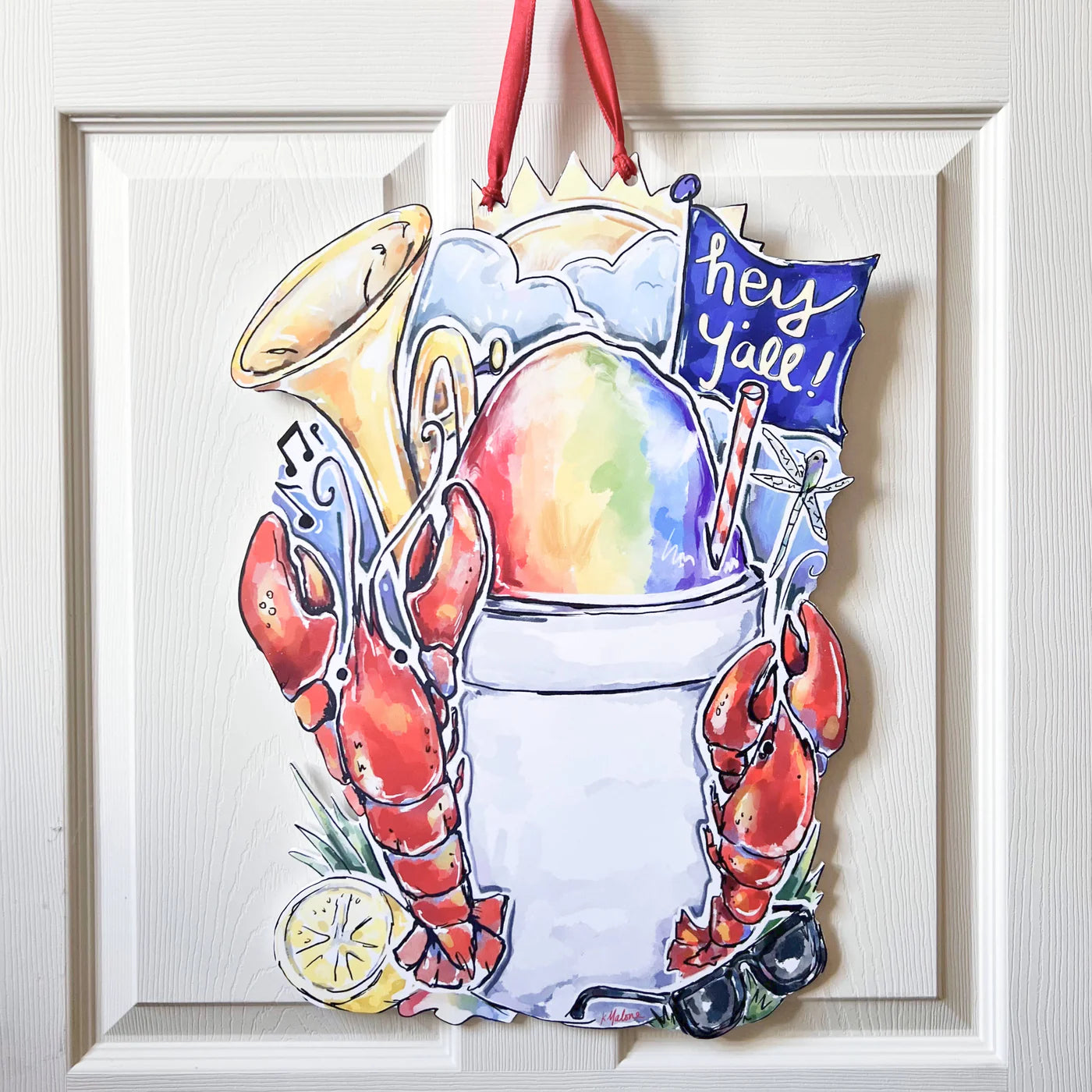 Y’all, if summer had a personality, this door would be it! It’s big, it’s bold, and it’s bringin’ all the summer sass. Step into the vibrant warmth of the South with this lively door hanger that captures the spirit of summer with a sensory welcome into all of your favorite warm-weather activities, including festival must-haves, crawfish, a sno-ball, a little jazz, and plenty of sunshine!