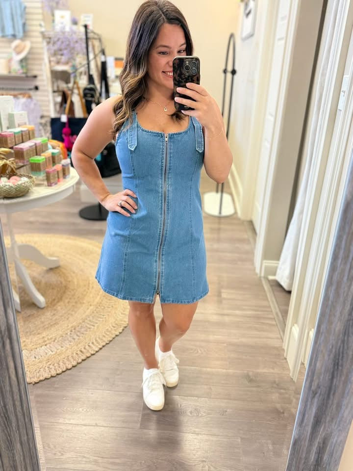 Say hello to your next denim obsession. The Sweet on Denim Dress is flirty, flattering, and made for sunshine-filled days. Designed with a double scoop neckline, adjustable buckle straps, and a full front zip for a touch of edge, this mini hugs your shape with subtle seams and a breezy A-line fit. Style it with sneakers for day dates or dress it up with heels for summer nights out. Either way, it’s love at first zip. 💙