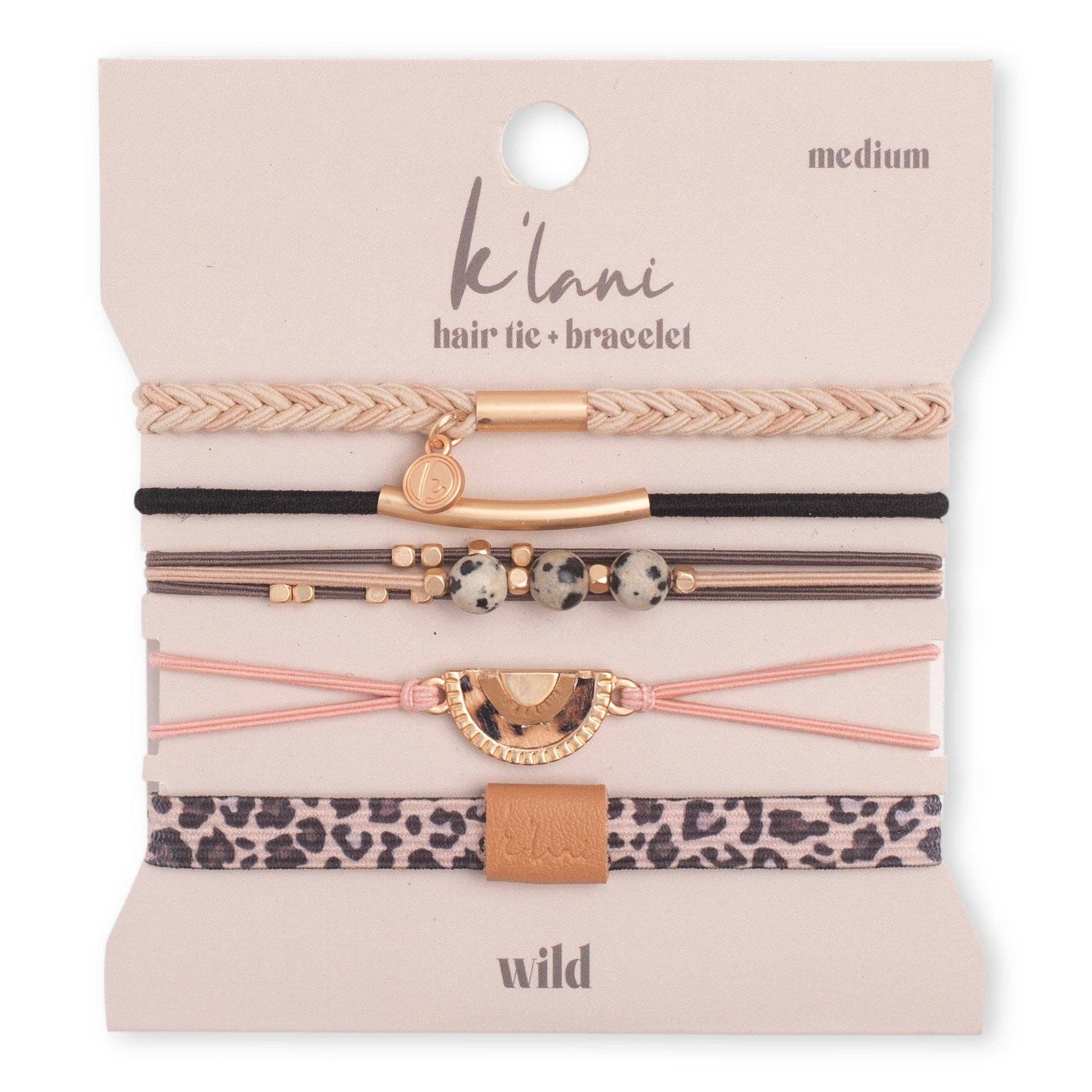 Our Wild set features animal prints and neutral colors that add a touch of untamed elegance to your look. This versatile accessory is perfect for keeping your hair in check while making a bold style statement on your wrist. Medium is the size of a normal hair tie band. It fits wrists between 5-6.4" around.